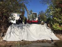 Dabei wurden immer größere Mengen an bereits verunreinigten Material zu Tage gefördert, wodurch umgehend durch das Land OÖ diese Arbeiten eingestellt wurden. Die Verantwortlichen der BH bzw. Land OÖ ordneten eine genaue und sorgfältige Sanierung dieses Störfalles an, wodurch die Tätigkeiten für die Feuwehr beendet waren. Ein Spezialunternehmen soll ab Montag diese Arbeiten durchführen, wodurch es zu einer Verlängerung der Mühlbachabkehr kommen wird. Sicherheitshalber wurde der Bereich mit einer Plane abgedeckt, um bei auftretenden Regenfall eine Verteilung des kontaminierten Erdreiches zu verhindern.
