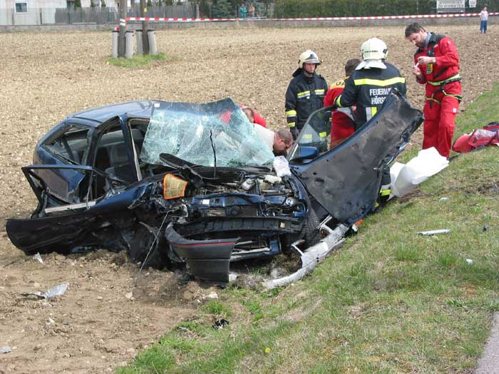 | Auf der B1 der Wiener Bundesstraße ereignete sich am 12. April 2003 um ca. 11.30 Uhr im Gemeindegebiet von Hörsching ein schwerer Verkehrsunfall. Bei einem Überholmanöver prallten 2 Personenkraftwagen frontal ineinander. Die Feuerwehren Hörsching und Rutzing wurden angefordert um eine eingeklemmte Person zu befreien. OBI Dipl.-Ing. Wolfgang Höglinger, Kommandantstellvertreter der FF Rutzing, musste als erster Feuerwehroffizier am Einsatzort die Lage inspizieren und konnte feststellen, dass die eingeklemmte Person schon vor dem Eintreffen der Feuerwehr befreit worden war. Die Aufgabe der Feuerwehren beschränkte sich hiermit nur noch auf das Absichern der Unfallfahrzeuge und der Unfallstelle sowie das Aufbauen eines 3-fachen Brandschutzes. Der Notarzt, der mittels Rettungshubschrauber eingeflogen wurde, musste die zum Teil schwer Verletzten behandeln. Medienberichten zur Folge erlag ein PKW-Lenker seinen schweren Verletzungen. Die Wiener Bundesstraße war über eineinhalb Stunden gesperrt. ORF Bericht ![]() ![]() ![]() 17 Mann der FF Rutzing standen im Einsatz Einsatzleiter: Kasieczka Josef, E-HBI | ||