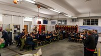 Da das Wetter eher „zum Daheimbleiben“ war, wurde der gemütliche Teil kurzerhand in die Fahrzeughalle verlegt. Dort warteten Bratwürstel, gute Stimmung und viele nette Gespräche.